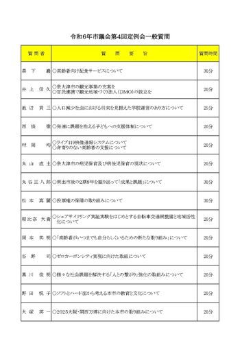 令和6年第4回定例会が招集されて、質問要旨が発表されました。出典【PDF】 発言通告 定例会は11月27日10時からです。 森下いわお「高齢者向け配色サービスについて」がトップバッターになっています。 松本まり「投票権の保障の取り組みについて」は8番目、…